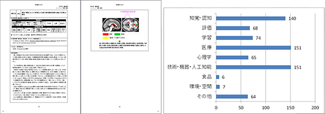 本文イメージ:収集した記事の書誌事項とともに方法や使用器具、詳細な説明を独自に付与(左)。収集した記事の分野別の解析をグラフにて収録(右)。